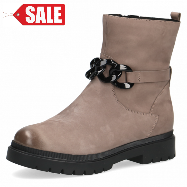 Enkellaarsje met dikke zool en ketting in taupe nubuck. Tevens met uitneembaar “Climotion” voetbed Nu van € 129,95 voor € 79,00