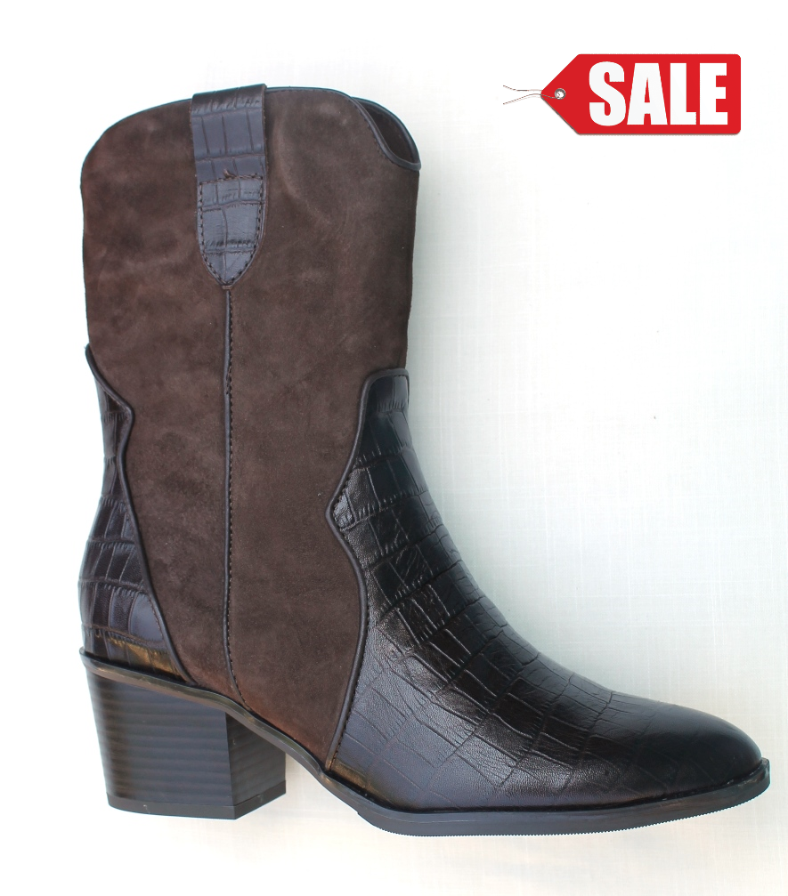 Gaucho laarsje in donkerbruin crocoprint leer/suède combinatie Nu van € 119,95 voor € 79,00