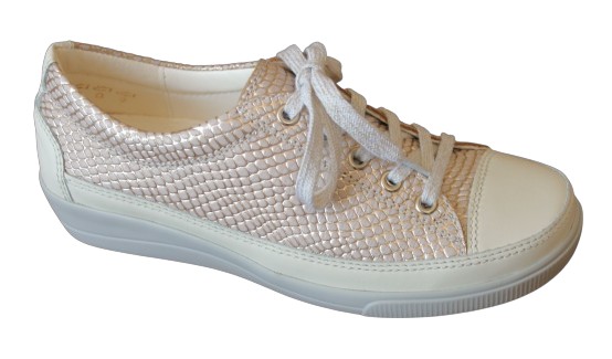Veterschoen van de “Pure Welness” lijn model Locarno op een H+ wijdte met uitneembaar voetbed en leer gevoerd in beige fantasieprint met offwhite leer € 190,00