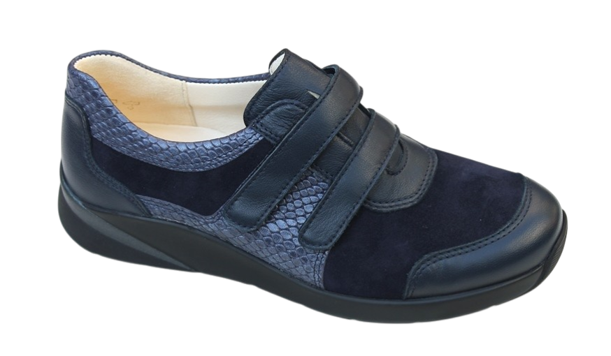 Klittenbandschoen van de “Pure Welness” lijn op een “G wijdte” in blauw leer/suède/fantasieprint combinatie met uitneembaar voetbed en leer gevoerd € 180,00