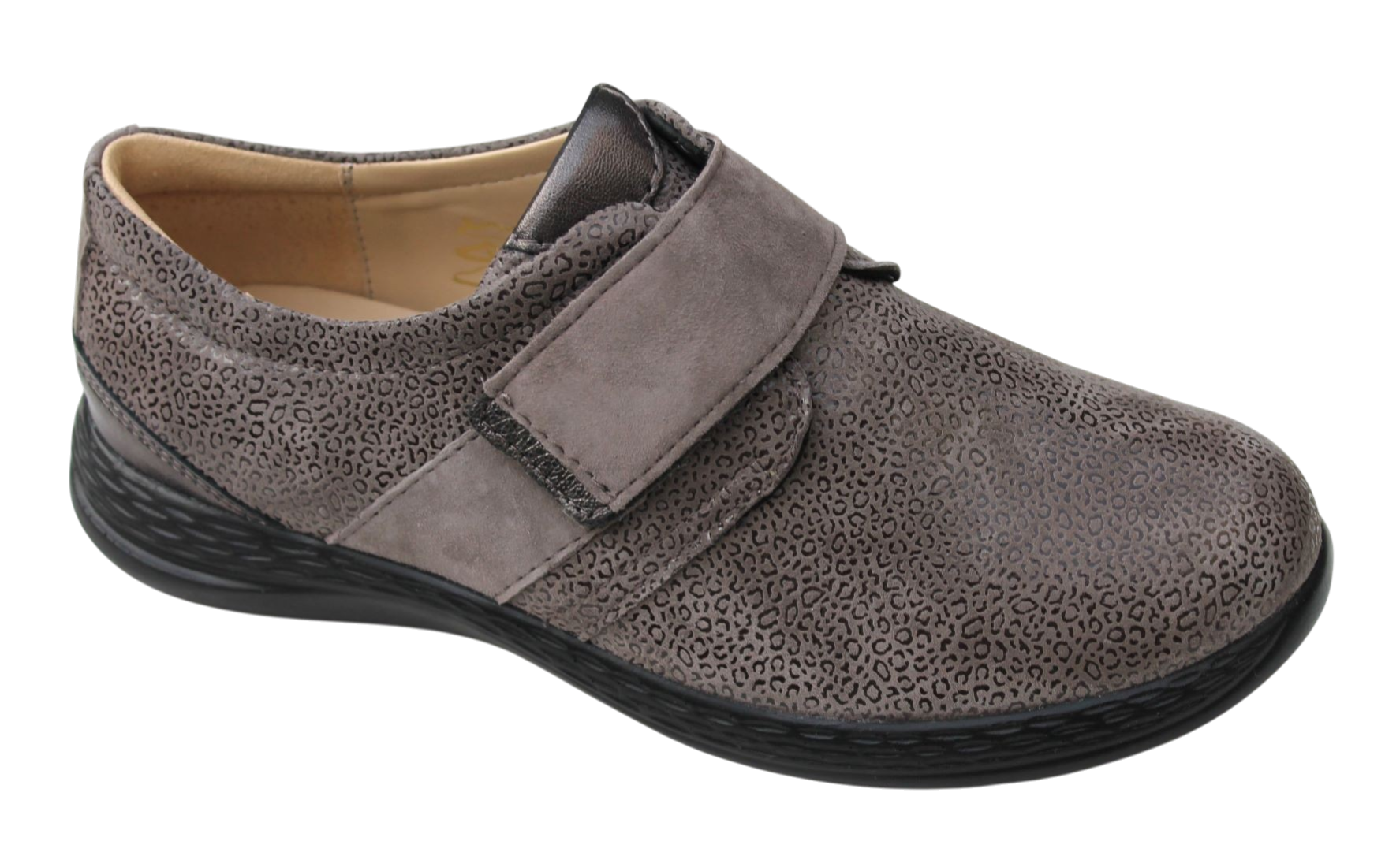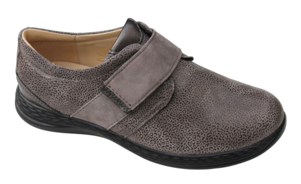 Klittenbandschoen met uitneembaar voetbed op een “H wijdte” in taupe fantasieprint. Het voorblad is voorzien van een zeer comfortabele “multistretch” € 170,00