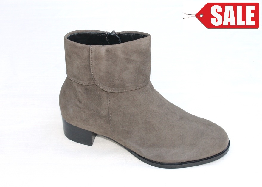 Enkellaarsje op een klein hakje, H wijdte en uitneembaar voetbed in taupe suède Nu van € 164,95 voor € 120,00
